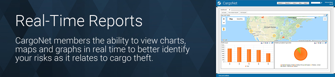 CargoNet gives members the ability to view charts, maps, and graphs in real-time to better identify their risks as they relate to cargo theft. We are optimistic you will and these enhancements to your liking, and hopeful you will take advantage of this new tool to aid in your proactive protocols to complement your theft prevention methods.