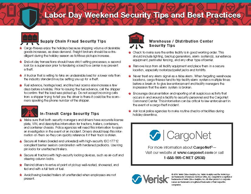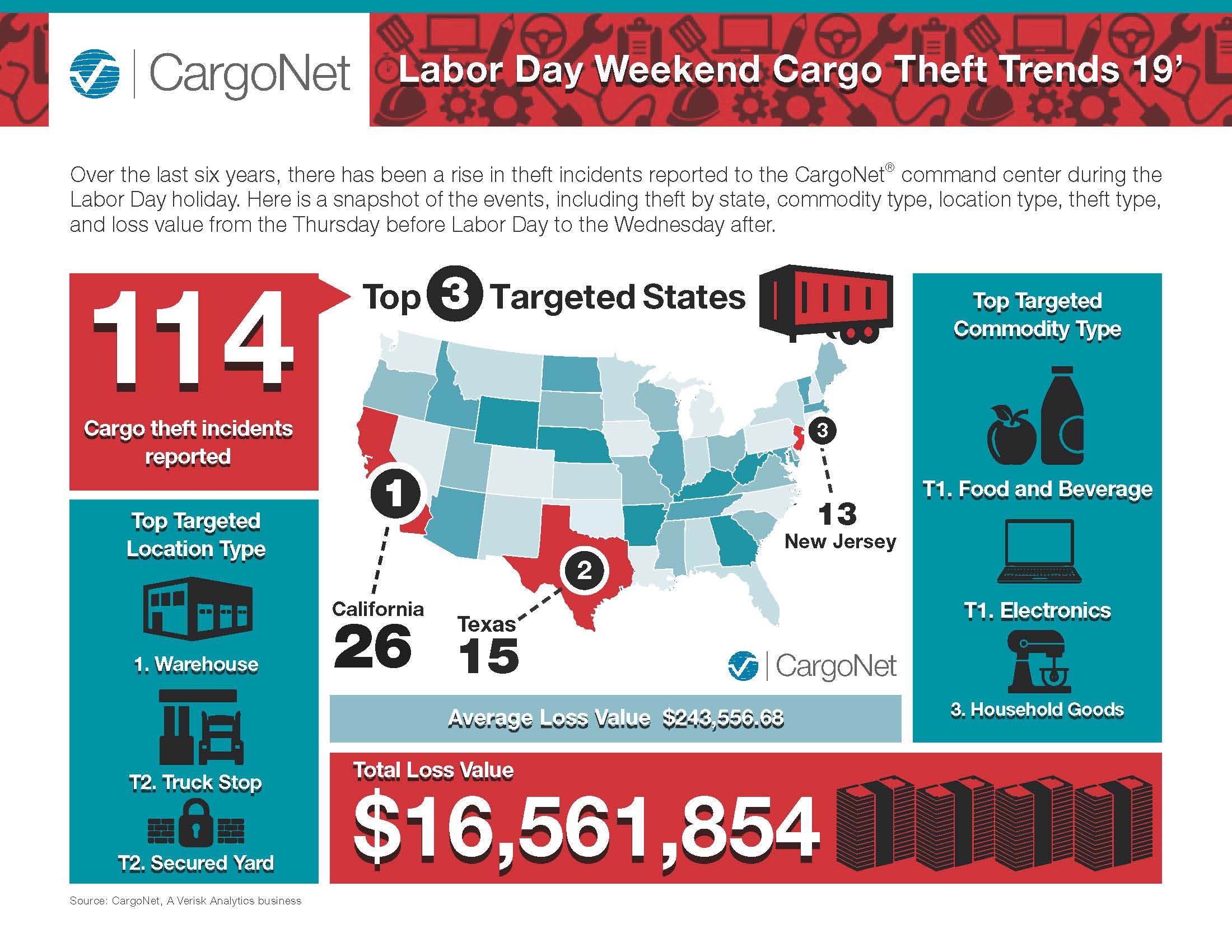 JERSEY CITY, N.J. — Holiday periods are known for increased risk of cargo theft because cargo thieves look to exploit an abundance of unattended trucks and closed warehouse facilities. To help preempt their activities, CargoNet® analyzed theft trends from the Thursday before Labor Day to the Wednesday after Labor Day from 2013 to 2018. CargoNet is a Verisk (Nasdaq:VRSK) business.